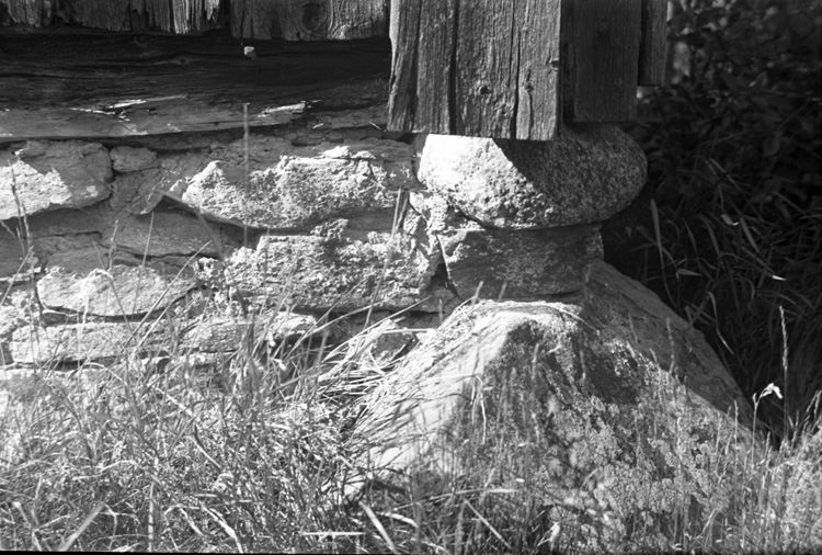 Text till bilden: "Dalslandstugan före flyttning, hörn grunden".