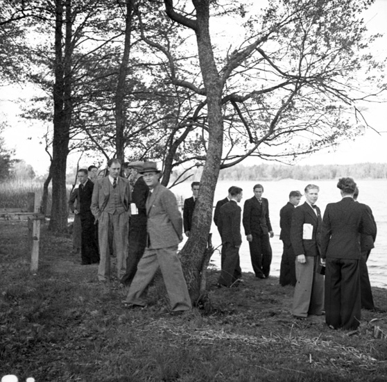 Text till bilden: "Elevgrupp vid strand".