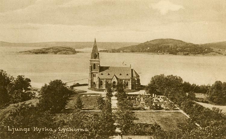 Enligt Bengt Lundins noteringar: "Ljungs kyrka med segelbåt i bakgrunden".