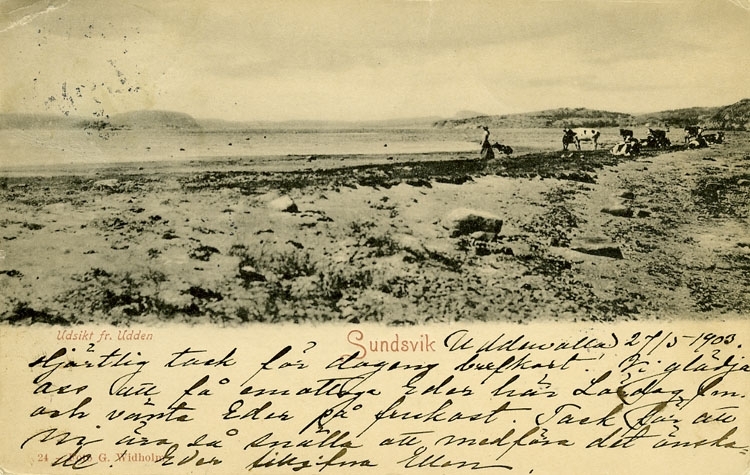 Enligt Bengt Lundins noteringar: "Sundsvik. Utsikt från udden. Kor på stranden".
