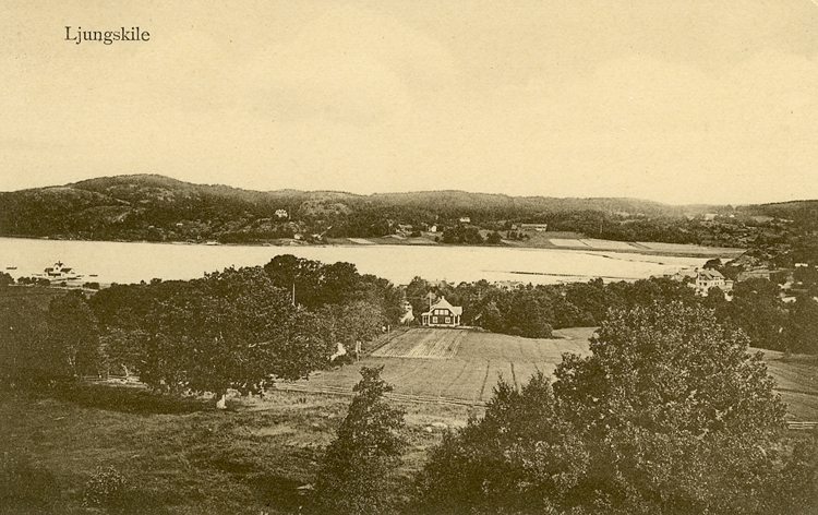 Enligt Bengt Lundins noteringar: "Ljungskile. Utsikt mot badhuset. Forsdalen. Järnvägsstation".