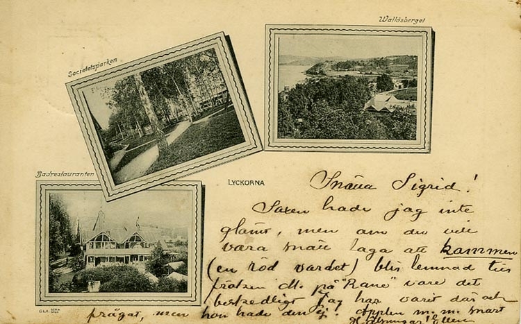 Enligt Bengt Lundins noteringar: "Badrestaurangen. Societetsparken. Wallåsberget. Lyckorna. 3-Bild".