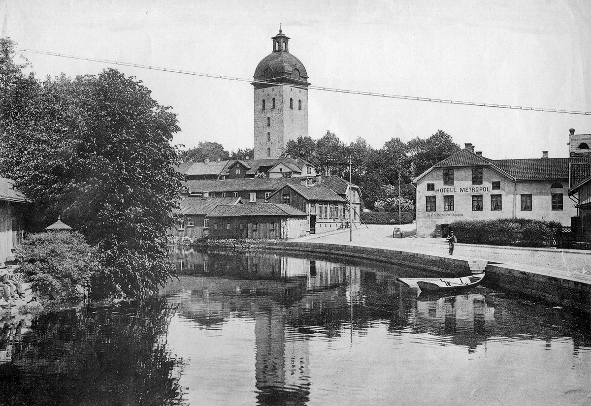 Vy från Viskan med Hotell Metropol och Flaméns Vattenfabrik omkring år 1900.