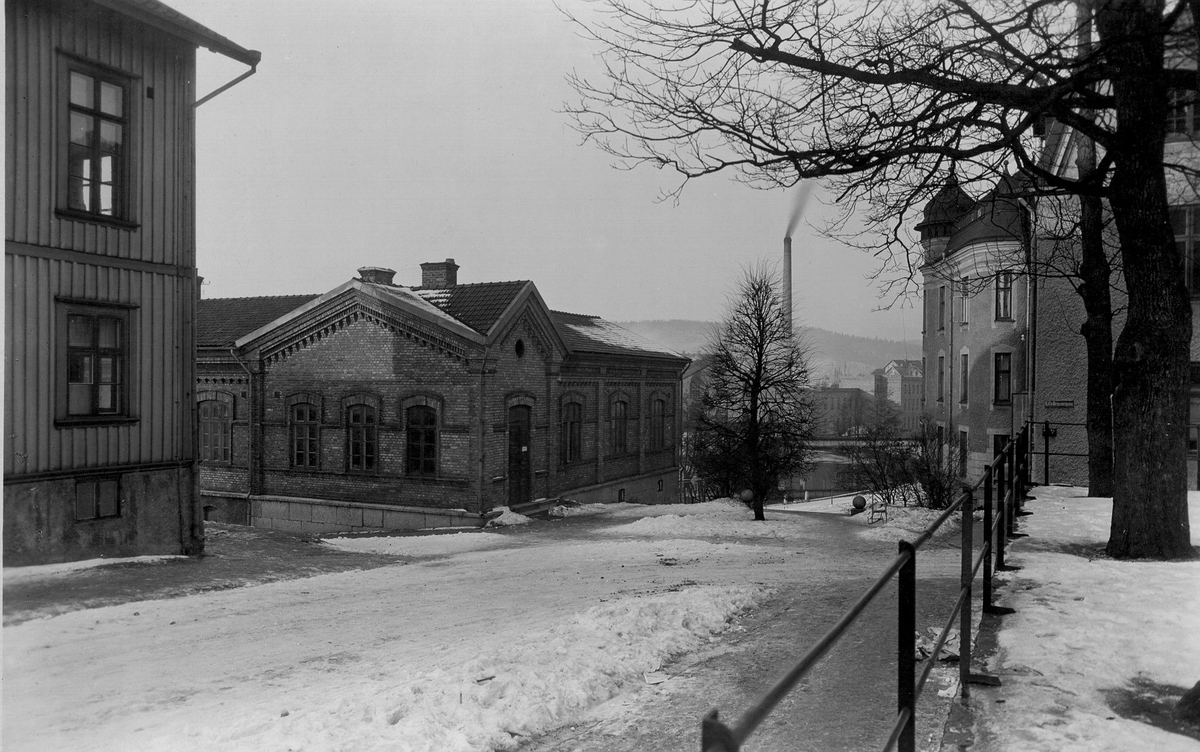 Stora Kyrkogatan med gamla läroverket och sockenstugea i kvarteret Capella t.v. den 15 jan. år 1924.