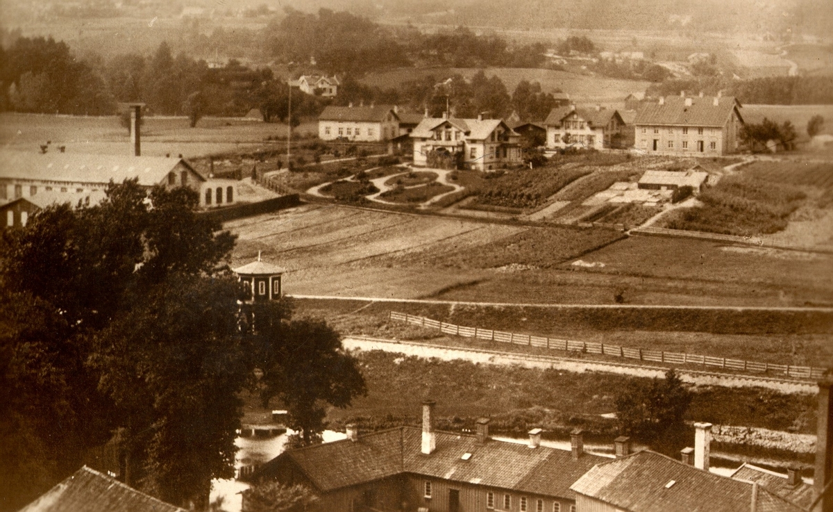Vy från Carolikyrkans torn mot väst med Linds Färgeri i förgrunden omkring 1890.
