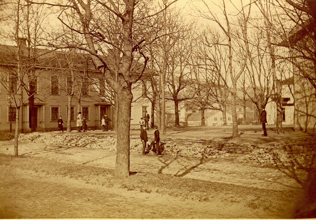 Borås Läroverk på 1890-talet. Detta låg vid Stora Kyrkogatan och på baksidan av fotot finns detaljerad information.