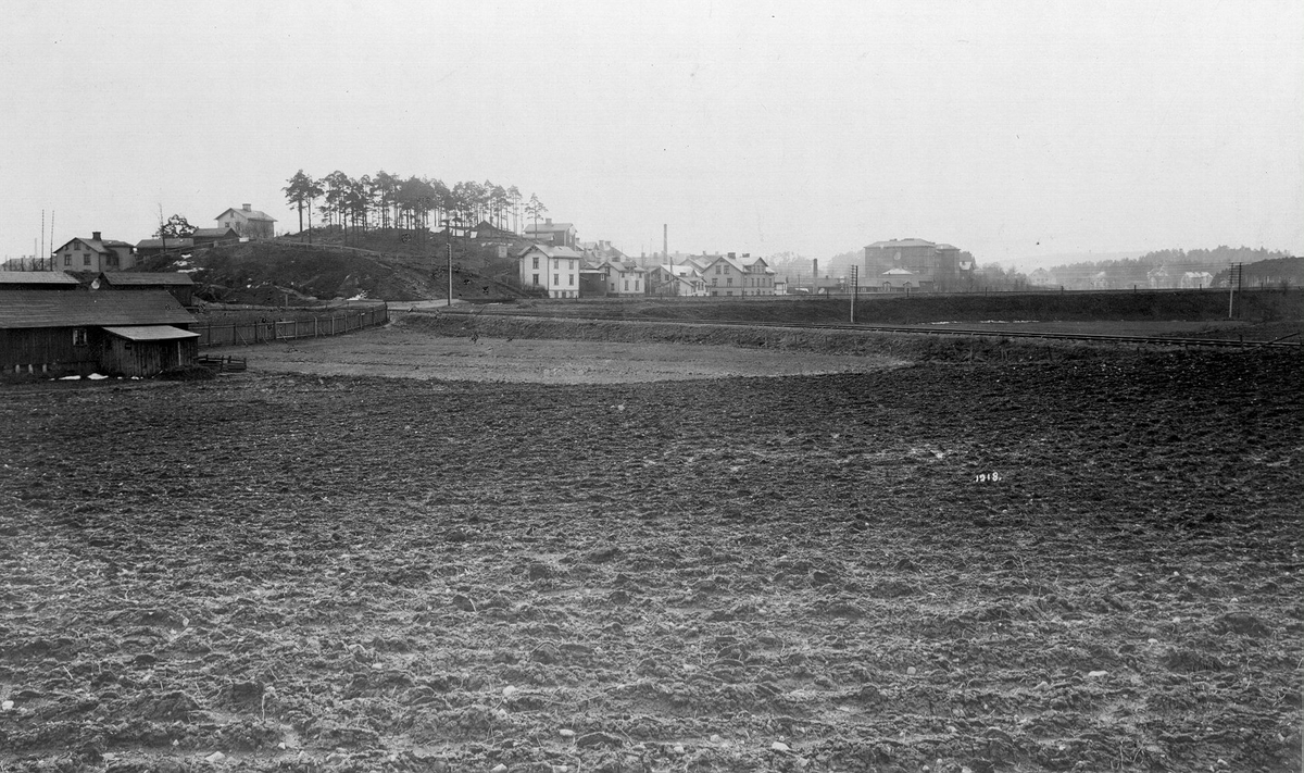 Norrby mot sydväst med Norrbyskolan vid horisonten år 1918.