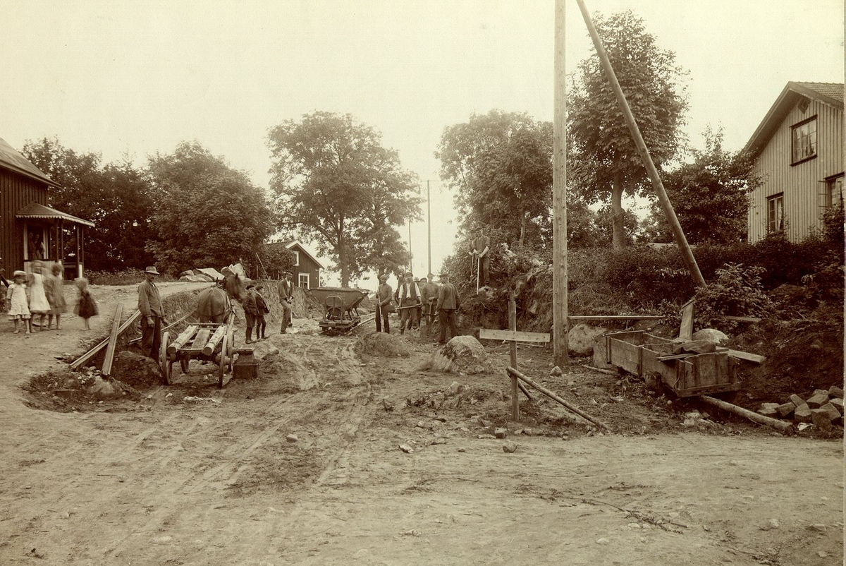 Gatuarbete vid Vegagatan mot nordost år 1914.