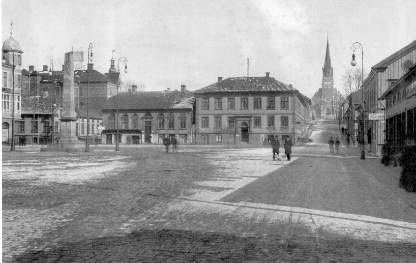 Stora Torget med Obelisken ("Tandpetaren") i mitten. Gustav Adolfskyrkan i bakgrunden var färdig år 1906 och byggnaderna i mitten, med bl.a. Nelsonska huset fick snart lämna plats för Rådhuset (1910).