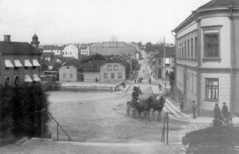 Stora Brogatan år 1901 sedd från Tekniska Skolans trappa. I huset t.h. fanns senare Molanders Konditori och idag Kafé Kvarnen.