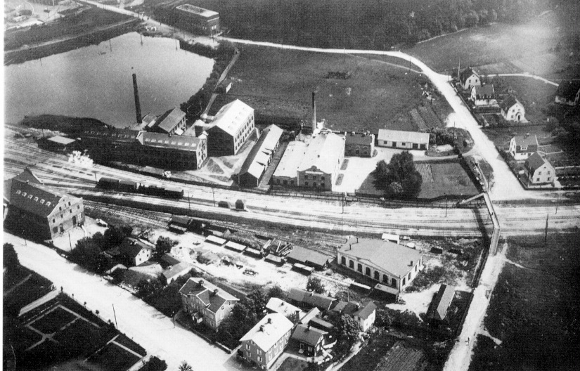 Flygfoto från år 1927. Överst t.v. ses Bockasjön, där idag Postens terminal ligger. I förgrunden gamla Göteborgsvägen vid Fridenshöjd.