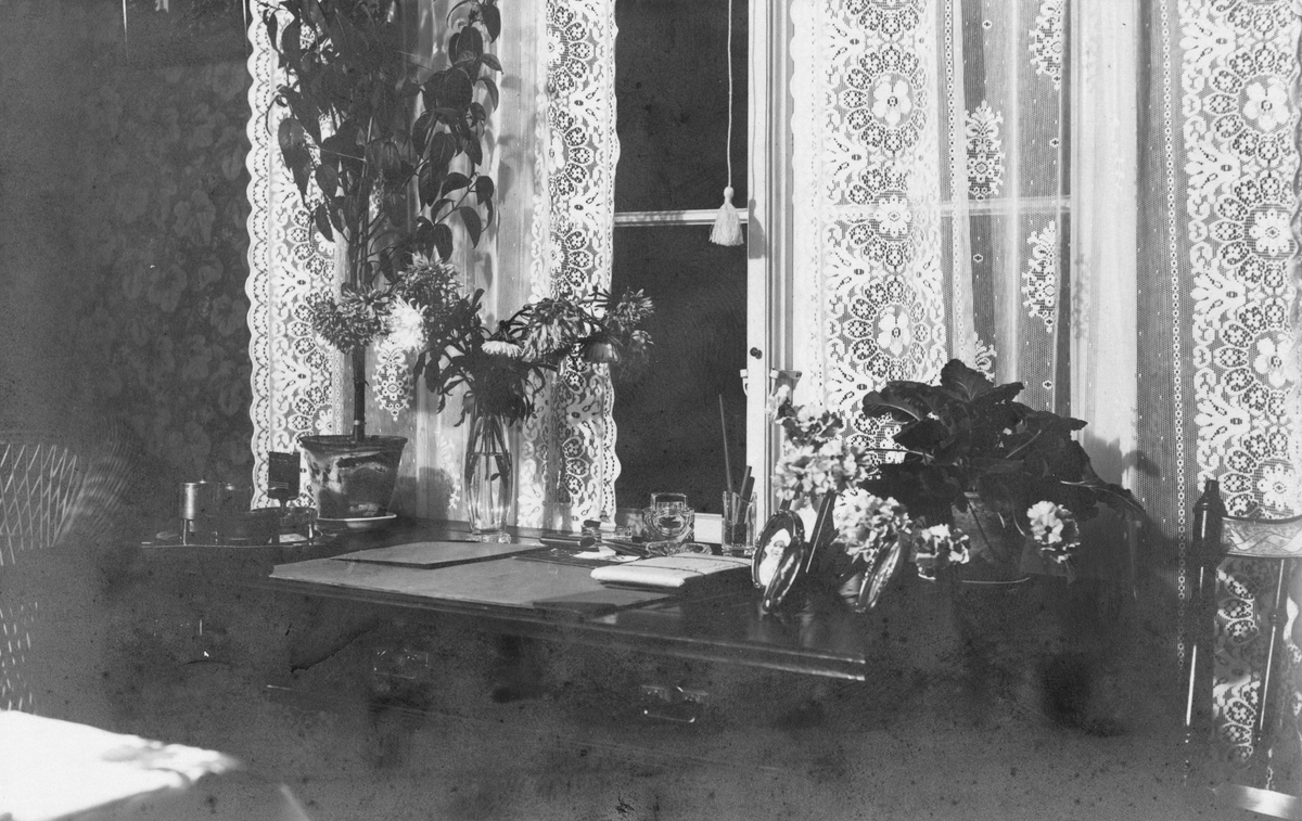 Interiör, skrivbord och spetsgardiner.