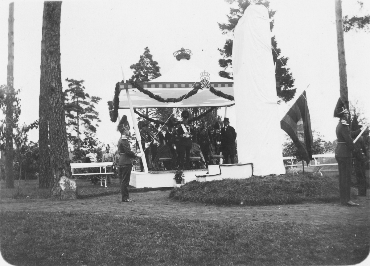 Kung Gustav V:s besök i Borås 1924. Folksamling vid Älvsborgs regementes 300-års jubileum. Kungen håller tal.