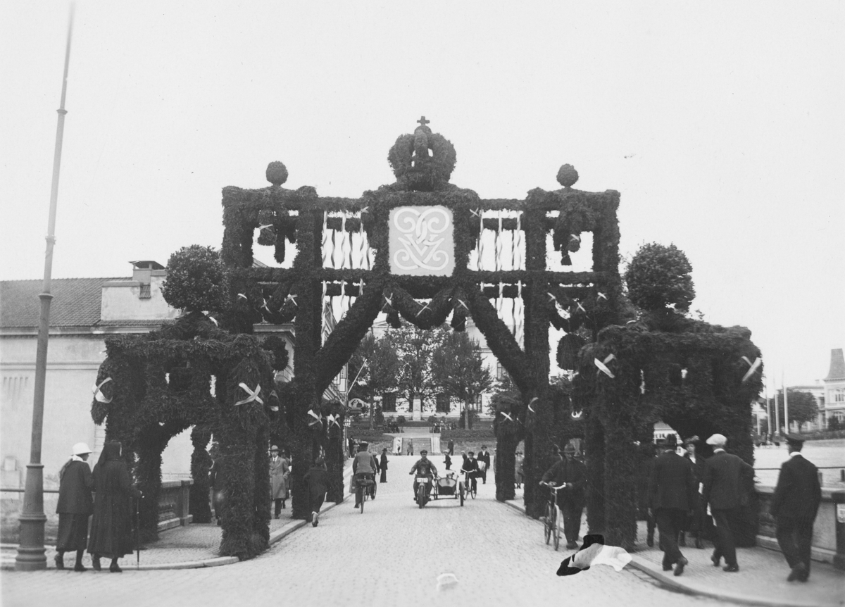 Kung Gustav V:s besök i Borås 1924. Västerbro utsmyckad med äreport och kungakrona.