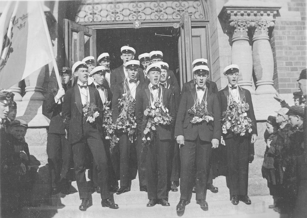 Studenter framför entrén Allmänna Läroverket (Bäckängsgymnasiet).