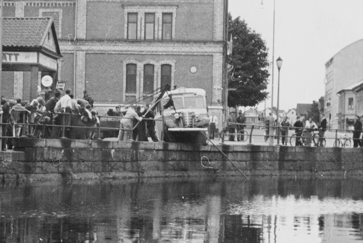 Stadsbuss har kört genom räcket till Viskan. Södra Torget, Sandwalls Bryggeri i bakgrunden.