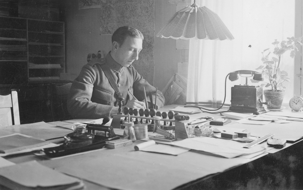 Soldat av högre rang antecknar vid sitt skrivbord. I bild syns även en telefon och ett flertal stämplar.