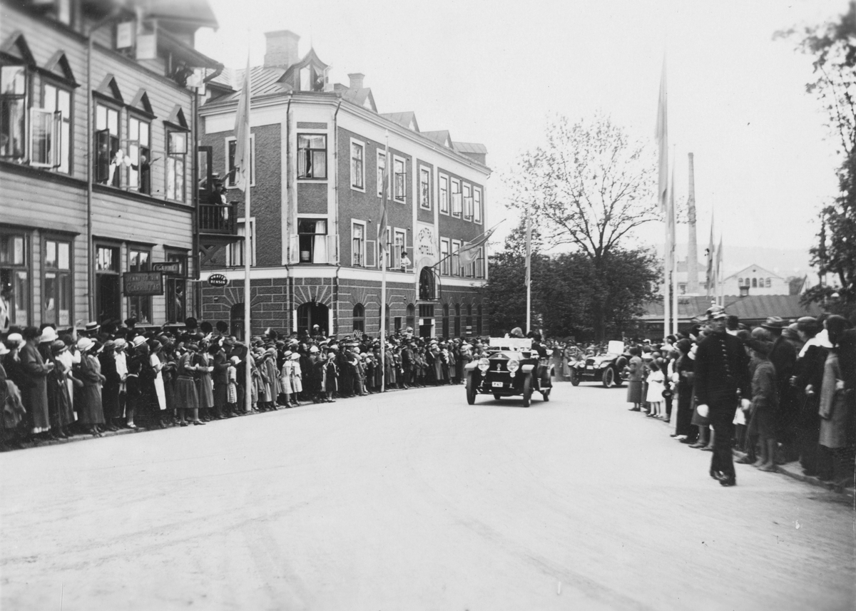 Kung Gustav V:s besök i Borås 1924. Ett ekipage med bilar passerar Central Hotell.