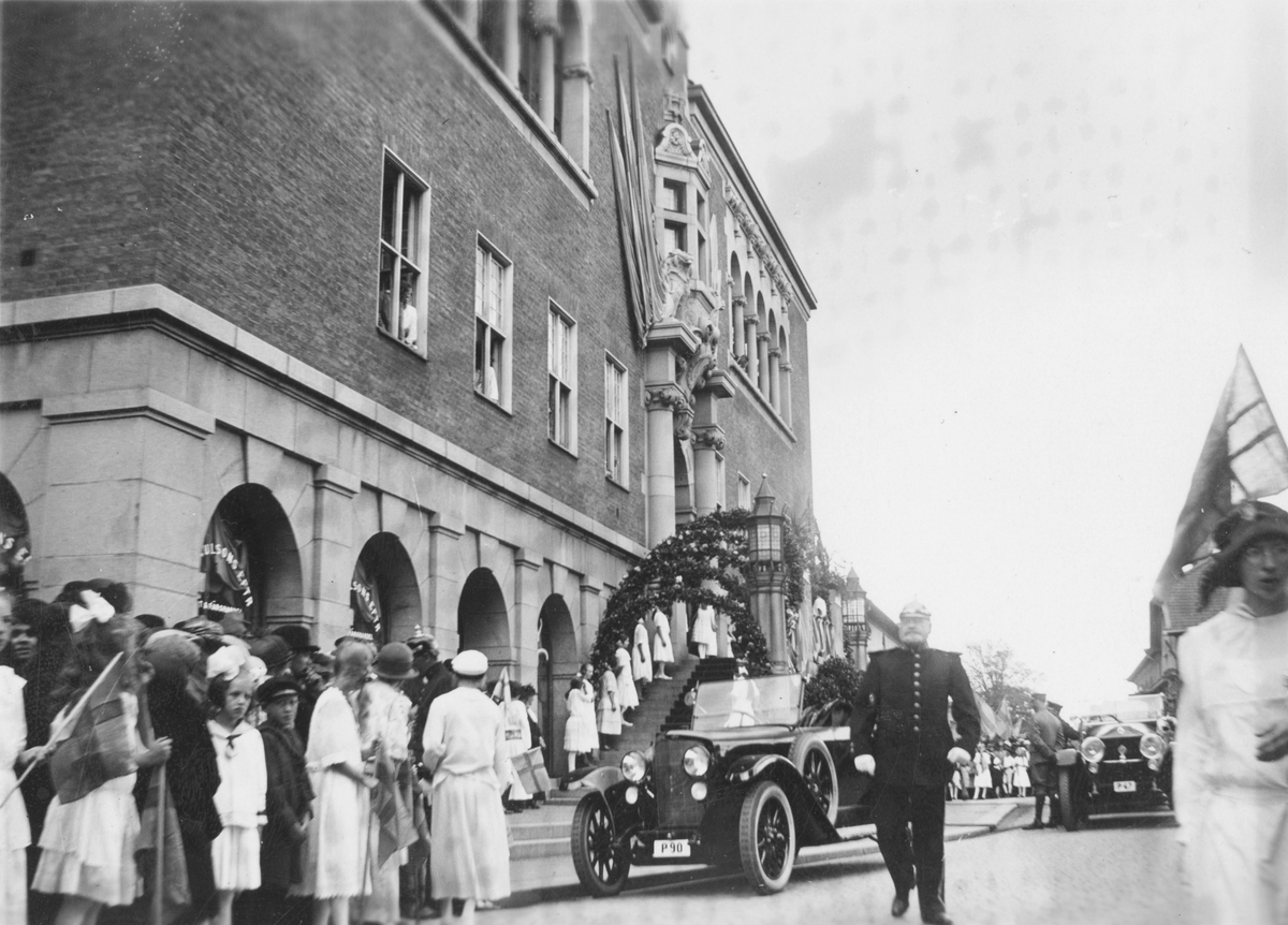 Kung Gustav V:s besök i Borås 1924. Ett ekipage med bilar och barn med flaggor står framför rådhuset.