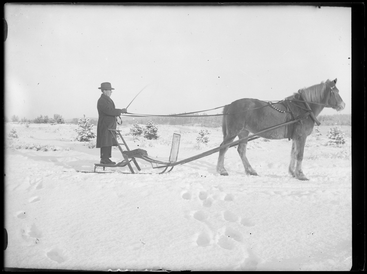 Oskar Eliasson på sparkstötting med häst, 1926.