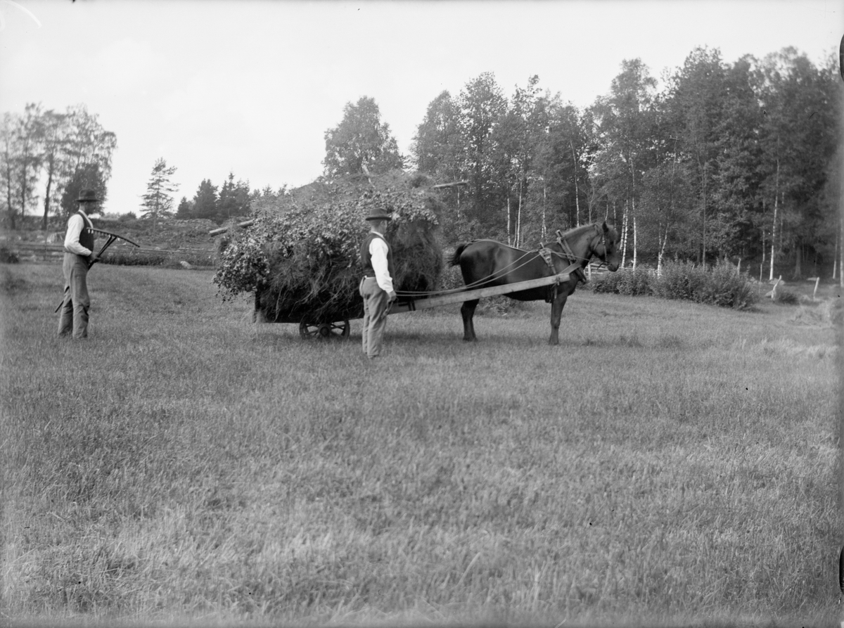 Två män och en häst med ett fullastat släp.