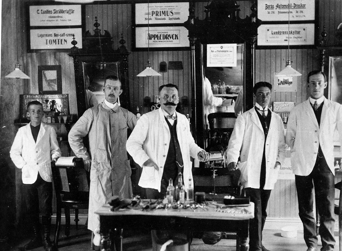 Frisersalong på Smedsgatan. Fr.v. Nr1 Gustaf Johansson, Nr3 Oskar Lundgren, Nr4 Dahlberg och Nr5 Claesson. Omkring 1910.