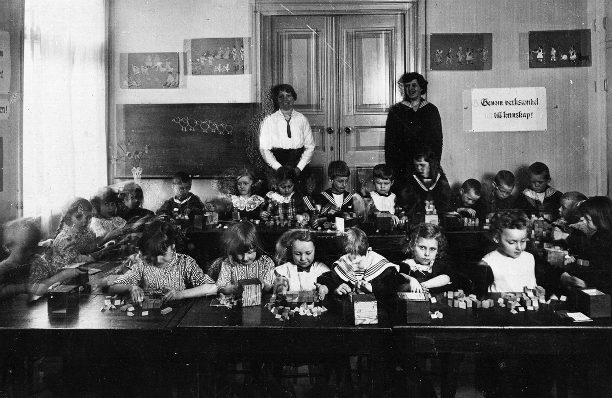 Kindergarten 1915 som låg på Österlånggatan (f.d. Sällfors Järnhandel). Lärarinnan i vit blus är Valborg Zetterwall-Bjönberg, assistenten heter Ruth Ögren.