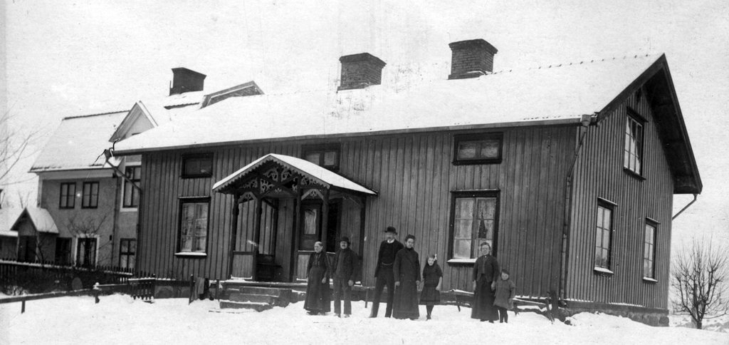 Kvarteret Kamelen Arnäsholm, Hagagatan 10, Borås. 1910 ca. Svante Adamsson med familj utanför huset.