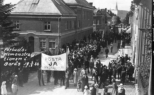 Förbudsdemonstration mot rusdrycker den 6/8 år 1922. Här vid Sturegatan utanför Caroliskolan. IOGT:s ordenshus låg längre ner i korsningen med Södra Kyrkogatan.