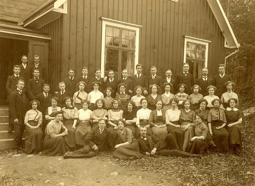 En samling personer utanför ett hus. Oidentiferat sammanhang år 1912.