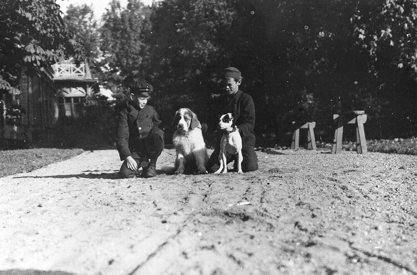 Gerard och Olof med hundarna "Björn" och "Lisa" vid Annelund år 1903.