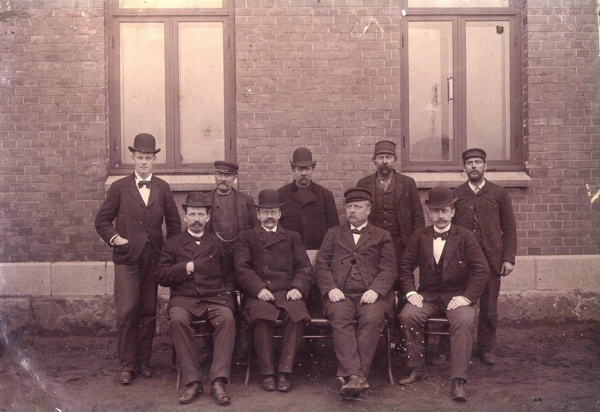 Personal vid Borås Mekaniska Verkstad år 1898. Sittande fr.v. Ing. August Lager, David Nylander, Birger Strömqvist och Edvard Bengtsson.
