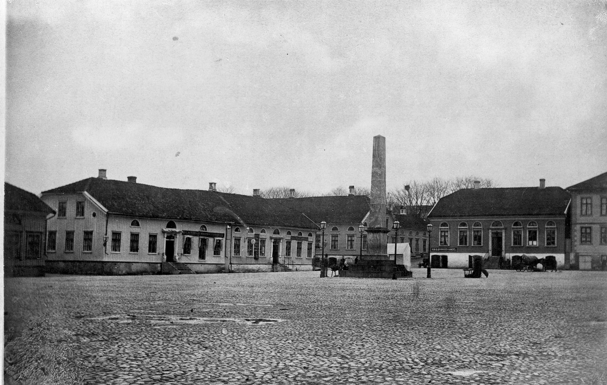 Stora Torget mot nordost med kvarteret Justitia t.h. där nuvarande Rådhuset ligger fotograferat runt 1880-talet.