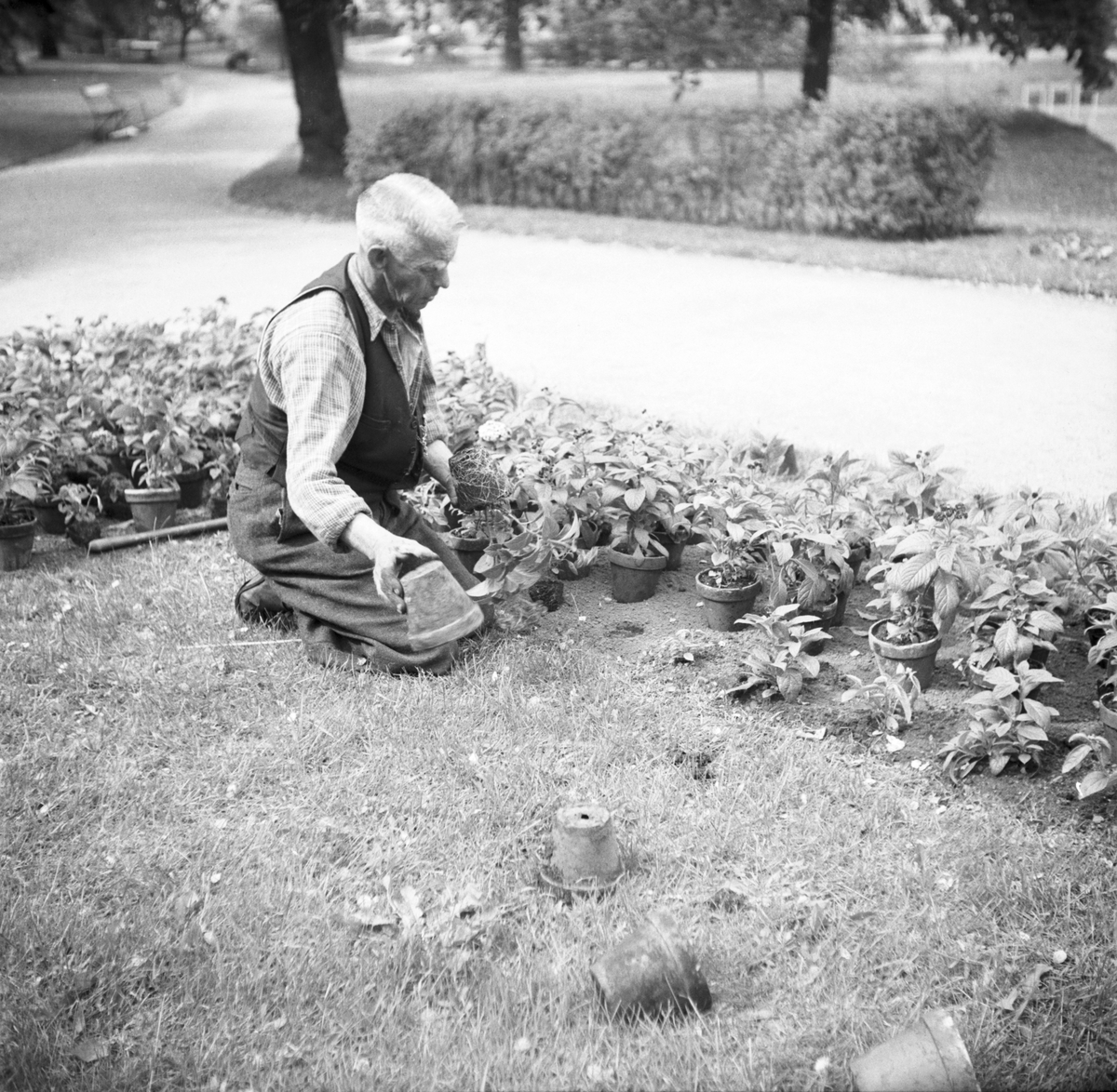 Två trädgårdsmästare placerar ut växter på en gräsmatta. Bild från Stadsparken med Wäveribolaget i bakgrunden.