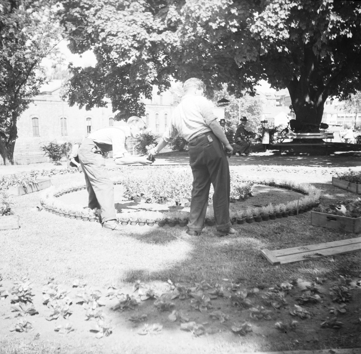 Trädgårdsmästare sätter ut plantor i Anna Lindhs park, dåvarande Bryggarparken. I bakgrunden syns Viskan och Wiskabergs fabrik.