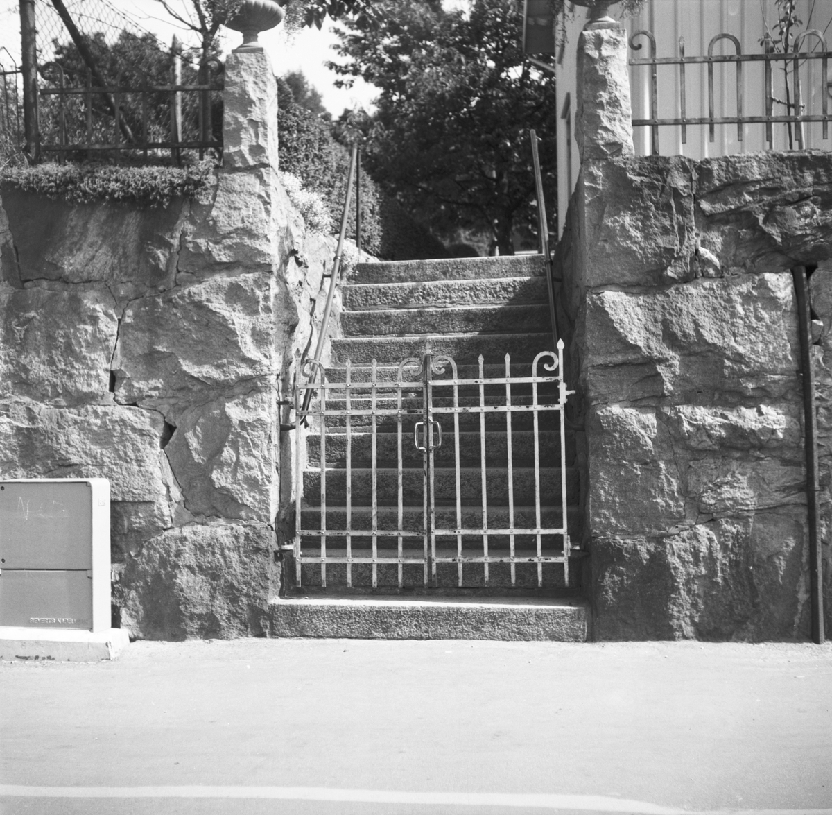 Bilder från Samhällsbyggnadsförvaltningen. Stenmur med grind och trappa, 40-tal.