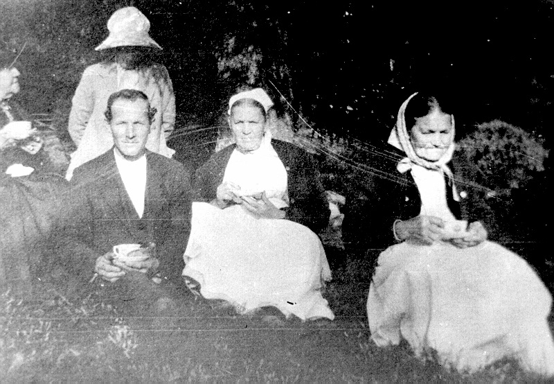 Johan Larsson ("på Tån") med Anna-Lena och Kristina och bakom dessa Sara Dalsjö med fru söderberg på 1920-talet.