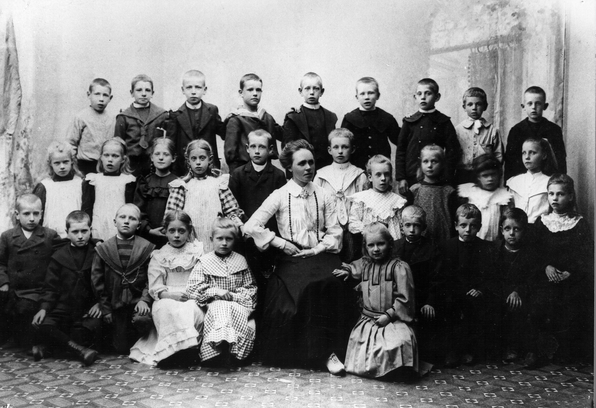 Skolklass vid Norrbyskolan år 1905 med läraren Elin Karlsson-Fagerlin. Identifierade är Kalle Englund (nr.3 fr.v. i främre rad) och Rolf Lange, nr.4 fr.v. i övre rad.