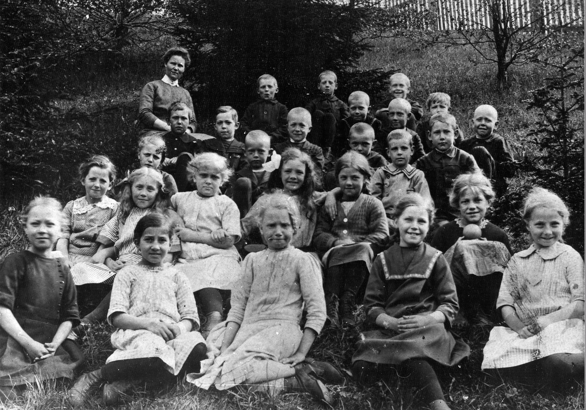 En småskoleklass med lärarinnan Betty Gustafsson och närmast henne Gustav Klarén, som blev en känd brottare. Foto från omkring år 1915.