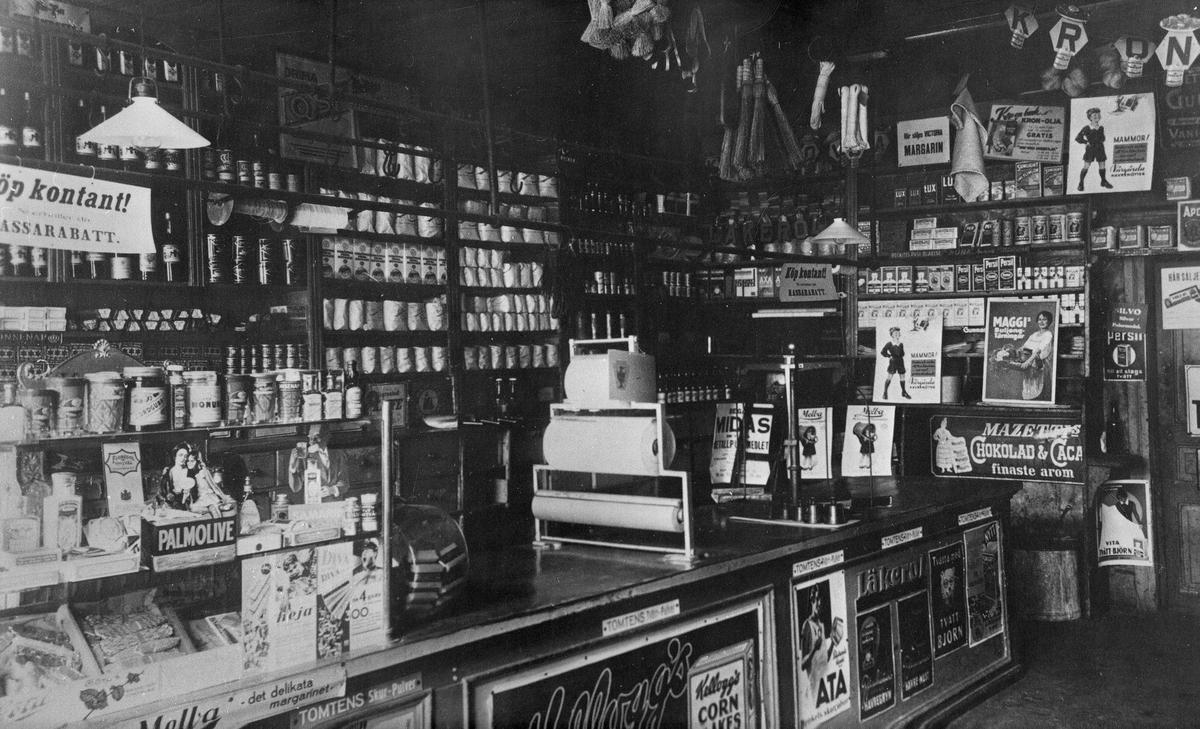 Interiör från en speceri- och diversehandel vid sekelskiftet.