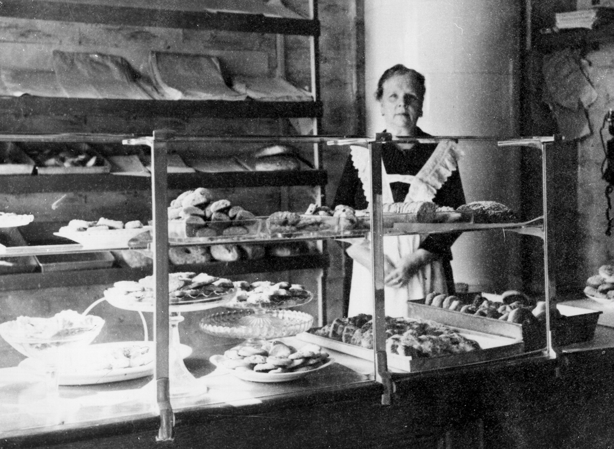 Fru Selma Broberg vid disken i sin bageributik vid Norrby Långgata omkring år 1915.