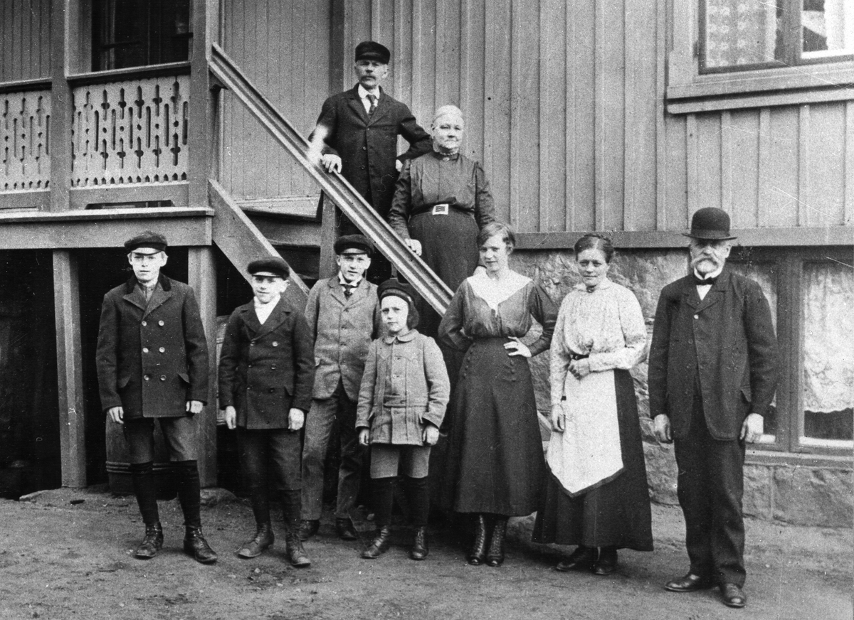 Palmelund 1 vid Norrby Långgata 11. Fr.v. Hans Borg, Evert Johansson, Robert Borg, Gösta Åman, Anna Höglund-Olsson och Hilma Johansson. På trappan står Axel och Mariana Svedberg. Foto taget år 1918.