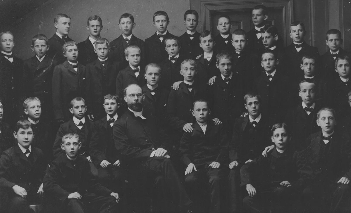 Pastor Skoglunds konfirmander år 1905. Längst upp t.v. i bakre raden står Artur Mingetting och nr. 3 i samma rad Charles Sandberg, känd som mångårig vaktmästare på biograf Röda Kvarn.
