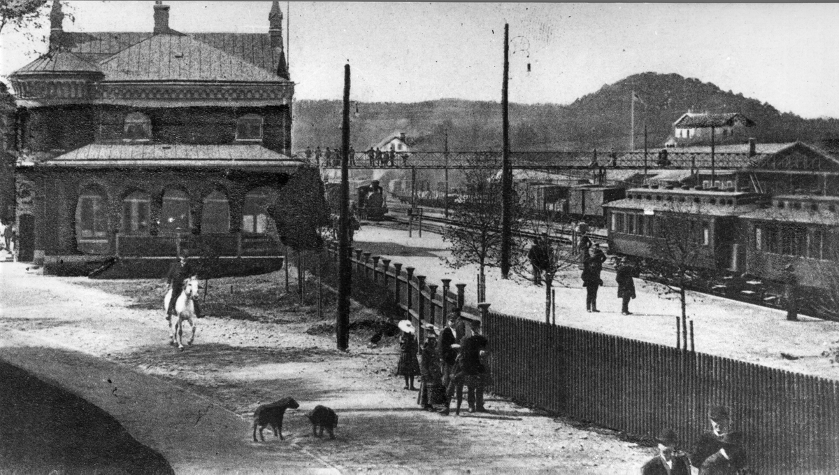 "Borås Nedre" järnvägsstation med viadukten över bangården vid sekelskiftet.