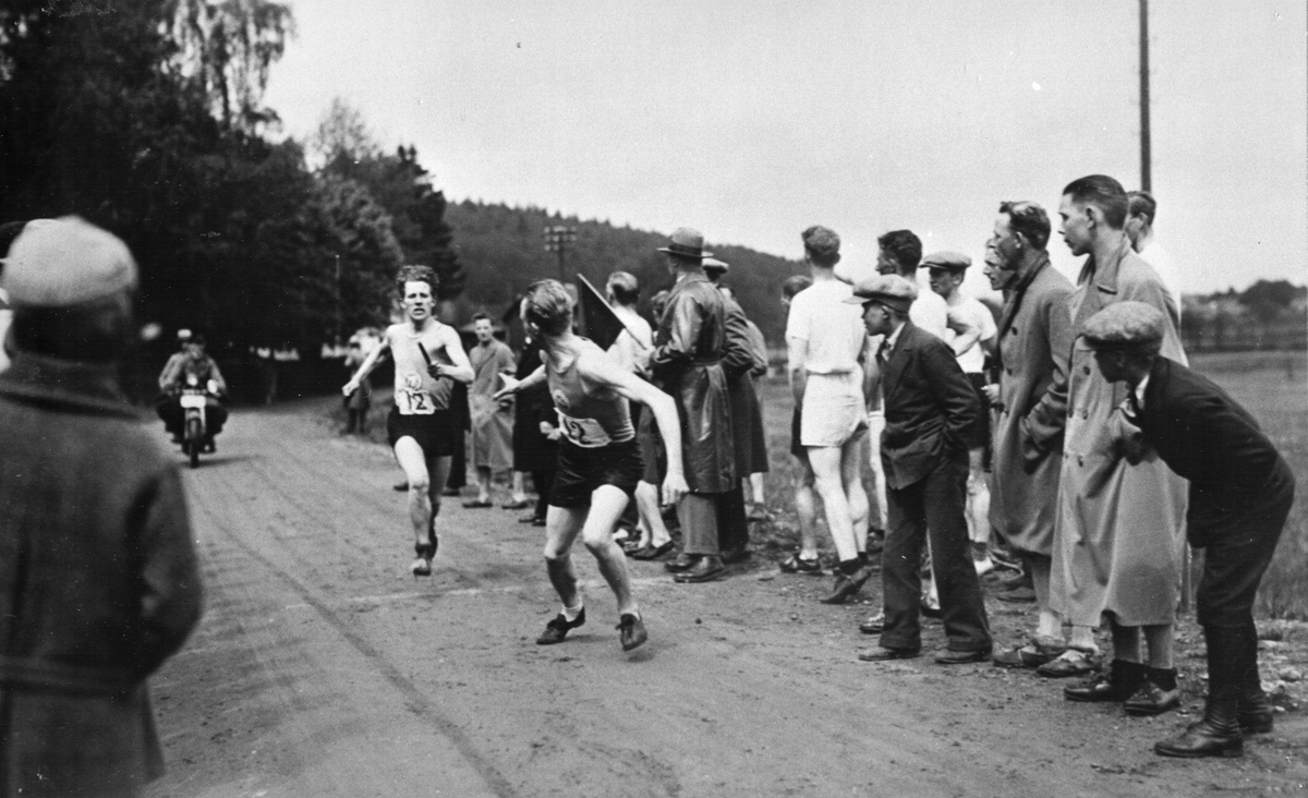 Från stafettloppet "Borås runt" som var ett populärt idrottsevenemang under många år. Här ses en växling på Getängsvägen vid en tävling på 1930-talet.