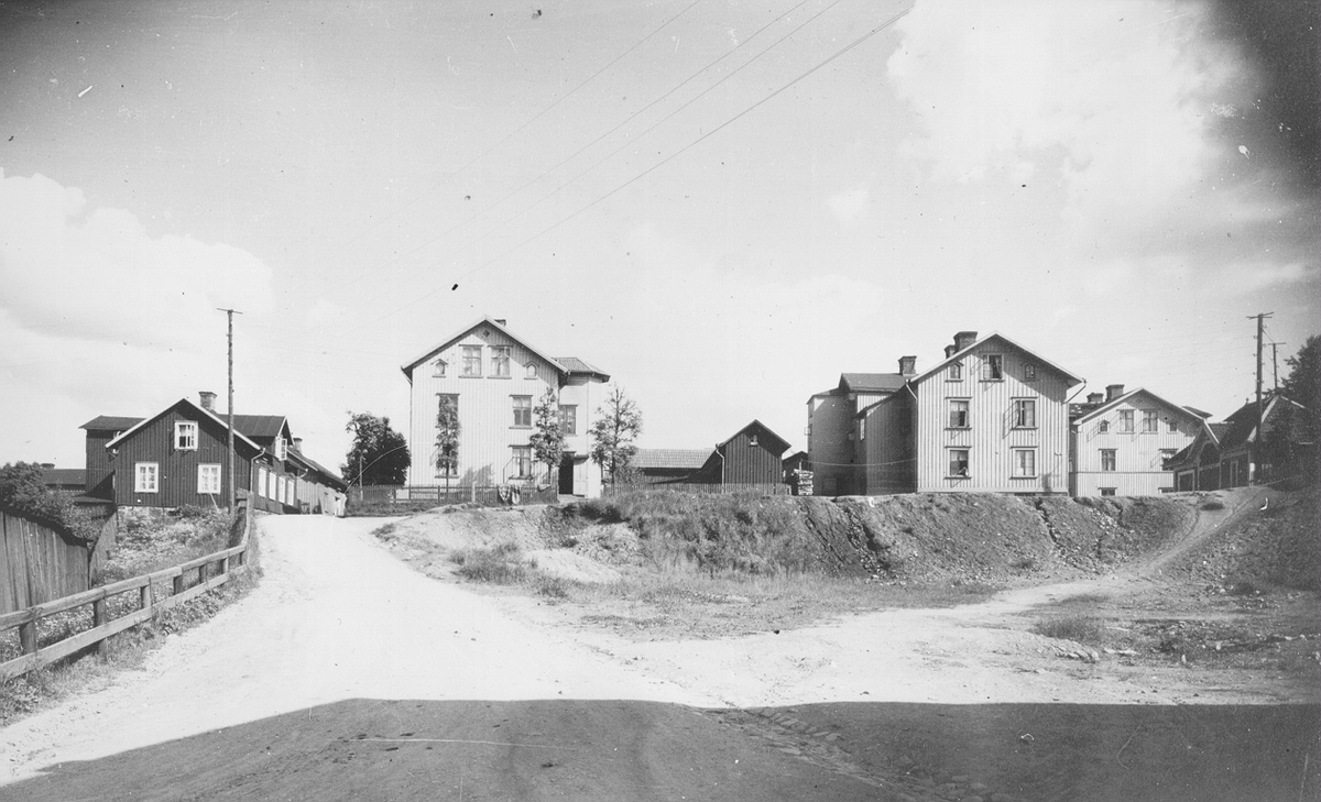 Kronängsgatans slutmynning med Norrby Snickerifabrik innanför staketet till vänster och "Rullan" vid Norrby Tvärgatas slutpunkt t.h. omkring år 1920.