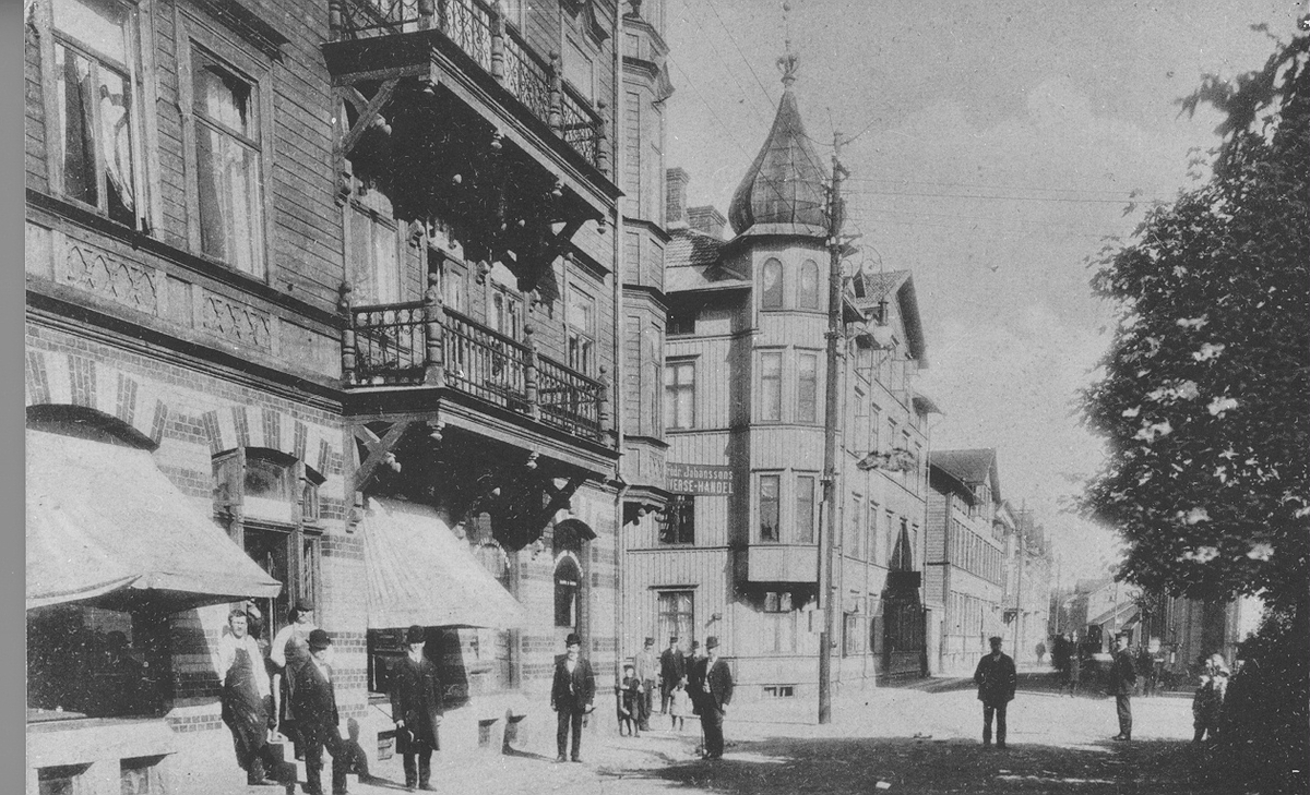 Norrby Långgata x Norrby Tvärgata en solig sommardag på 1910-talet. Enanders och Franstzichs hus närmast på bilden.