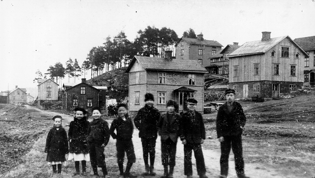"Skogsbacke" vid nuvarande Västra Nygatan. På bilden: Axel Sjöberg, Carl Gustafsson, Gustaf Sjöberg, Artur Sundin, Ruben Västerling, Gustaf Snygg och systrarna Carlstein år 1903.