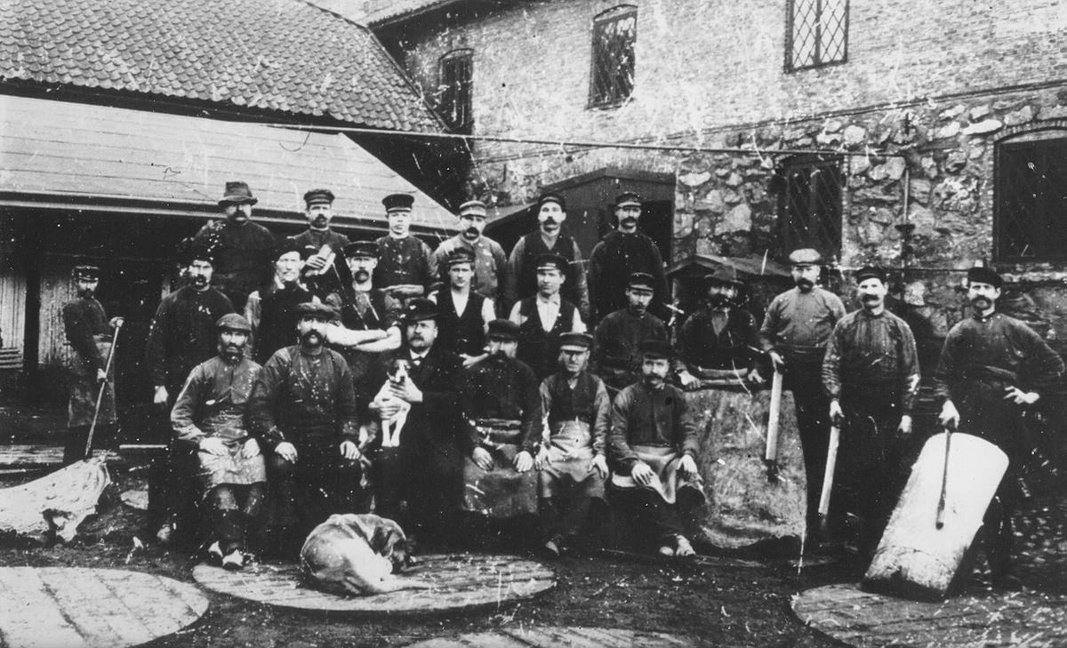 Arbetare vid Norrvikens läderfabrik omkring år 1915. Mannen med hunden är verkmästare Holmberg. Fabriken var belägen i kvarteret Simonsland där senare Konstsilke uppförde sina fabriksbyggnader.