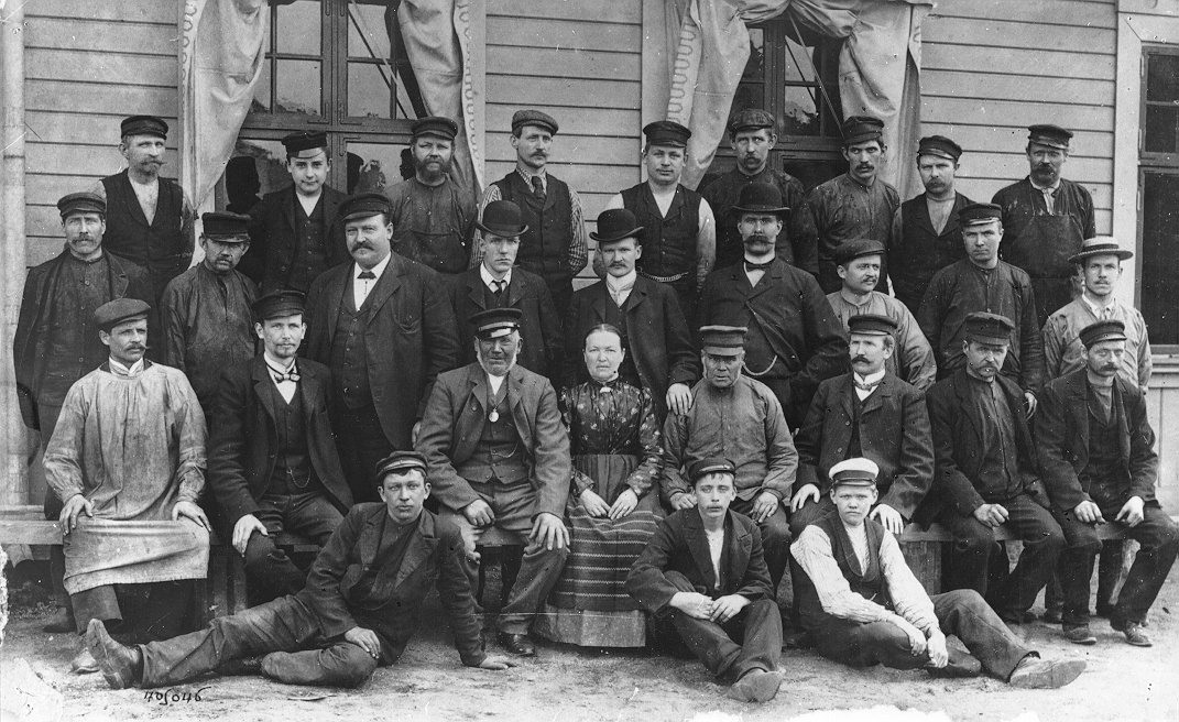 Chef och personal vid Vennerstens fabrik runt sekelskiftet. Andra rad nr.5 dir. Axel Vennersten, nr.6 verkmästare Claes Redin. Sittande på bänken nr.3 och 4 portvakt Erik Svensson med maka.